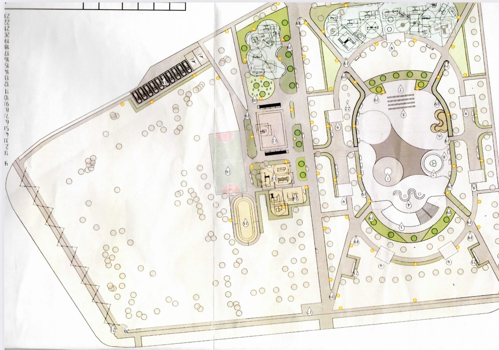 Формально всё выглядит безупречно. Есть конкурс, есть победа, есть концепция, есть документация. Но открывая материалы проекта, становится очевидно, что речь идёт не о тихом зелёном сквере, а о насыщенном общественном пространстве с функциональной нагрузкой. По проектной схеме территория разбивается на зоны с площадками, сценой, амфитеатром и инфраструктурой. В экспликации дополнительно фиксируются объекты обслуживания, что уже выводит пространство за рамки классического «сквера».
