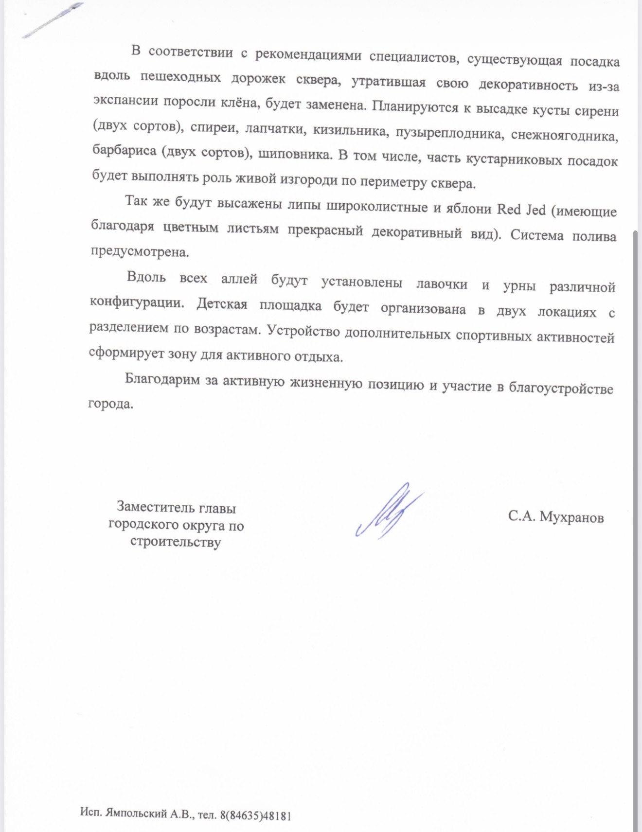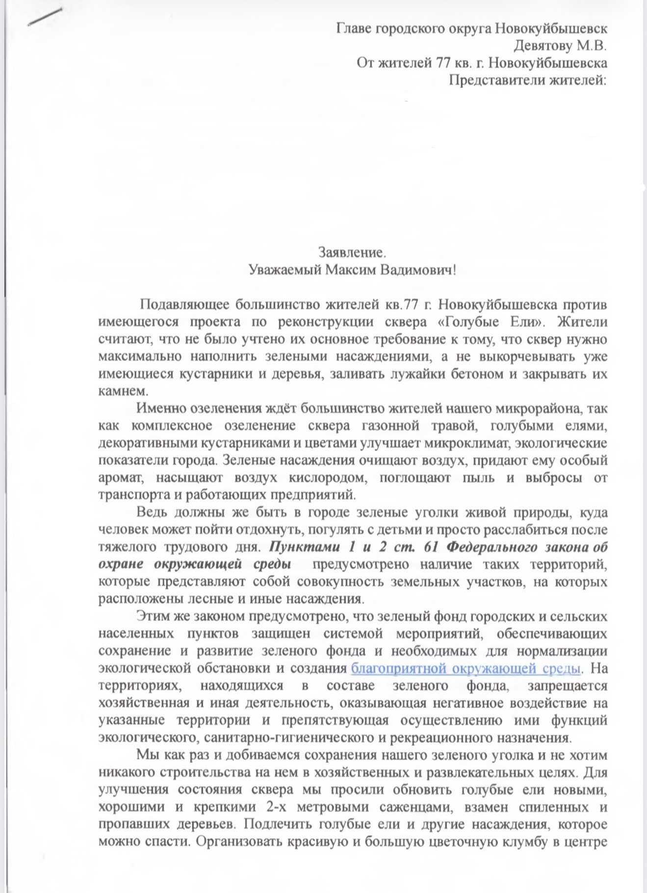 Жители официально обратились к врипу города Максиму Девятову, указав, что не согласны с концепцией проекта. В заявлении говорится, что сквер должен быть зелёным пространством, а не застроенной территорией.